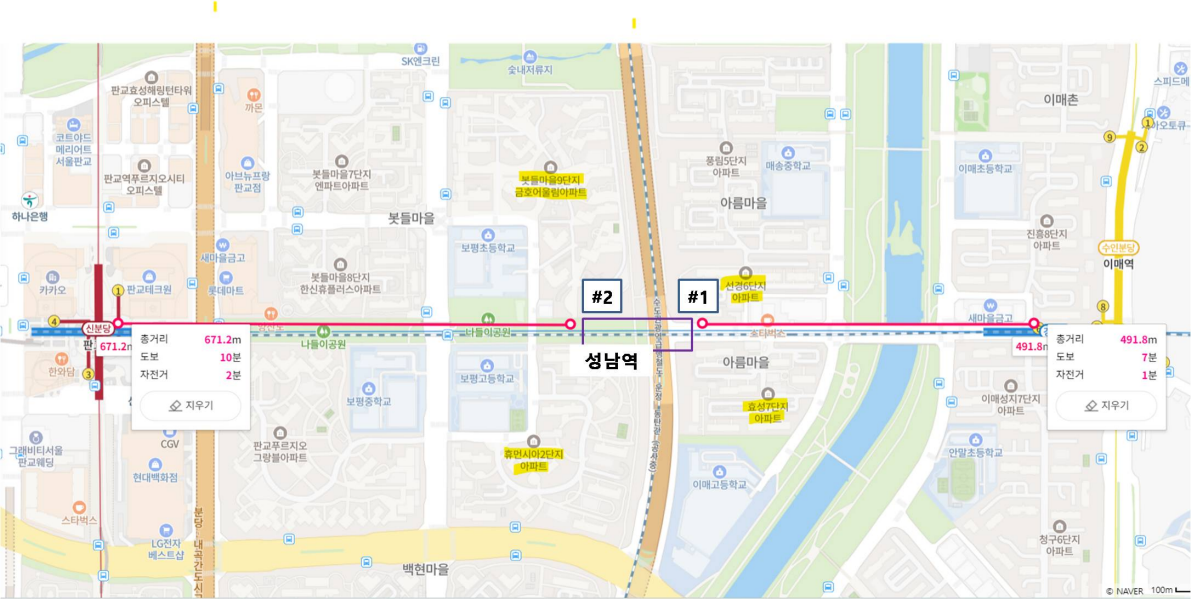 - 신분당선 판교역 방향으로는 약 670미터 도보로 약 10분 거리에 위치