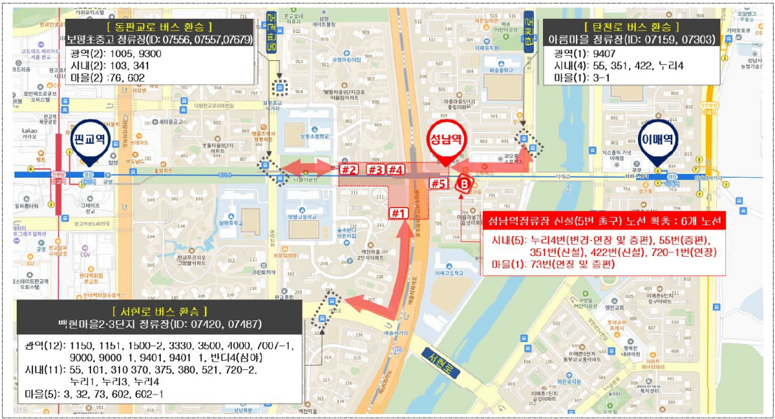 성남역 5번 출구의 경우 새로 신설되는 버스 정류장이 있으며 시내버스(5대), 마을버스(1대)를 이용할 수 있고 시내버스 2대의 경우 신설 노선으로 노선도는 아래 2번에서 자세히 살펴본다.