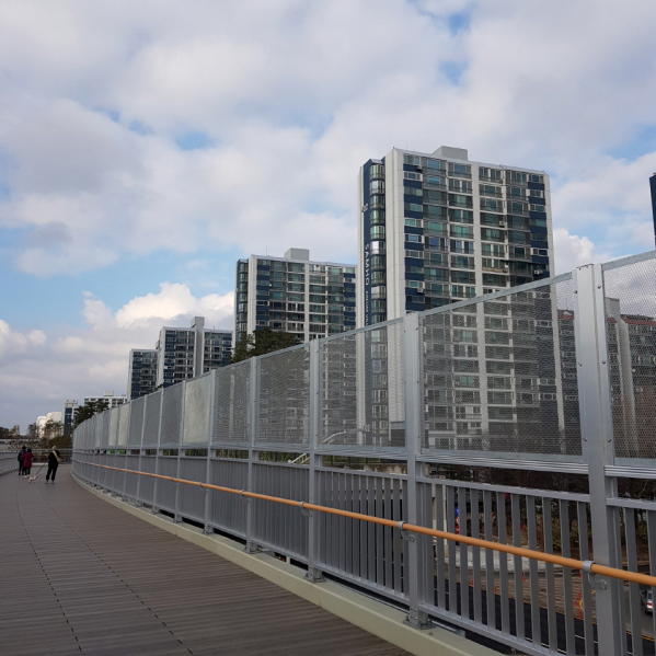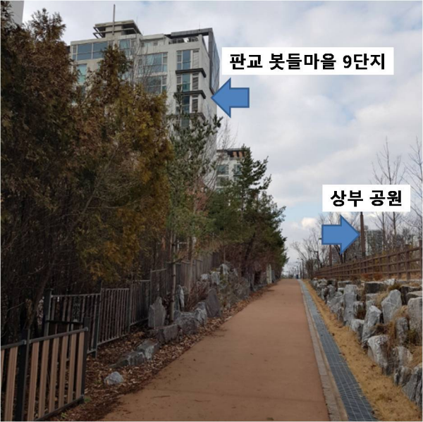 판교 방면 아파트의 경우 상부 공원과의 높이 차이가 거의 없다. 따라서 상부 공원에서 판교 아파트를 바라보았을 때 높은 곳에서 바라보는 것이 아닌 거의 단지 내부에서 바라보는 것 같다.