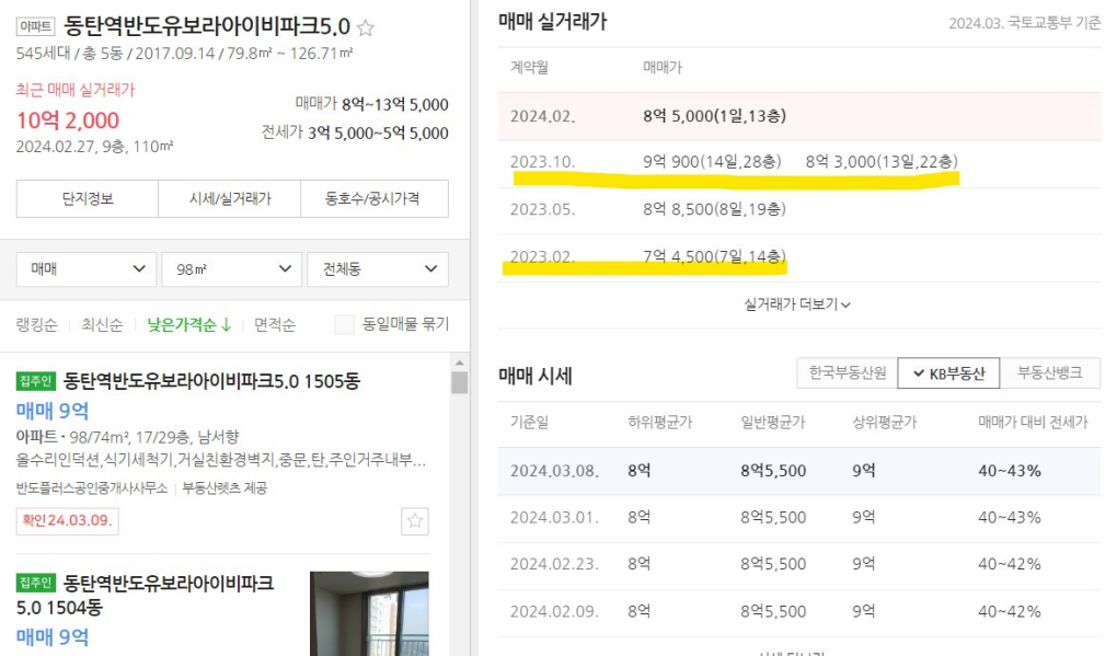 - 따라서 8개월 만에 9억 900만 원을 기준으로는 1억 6400만 원이 상승했지만, 8억 3,000만 원을 기준으로는 8,500만 원이 올랐다. 실거래가를 어떤 내역을 기준으로 하느냐에 따라서 거래 차익이 달라지는데 기사에서는 가장 높은 금액을 기준으로 잡아 상대적으로 높은 차익을 낸 것처럼 보인다.