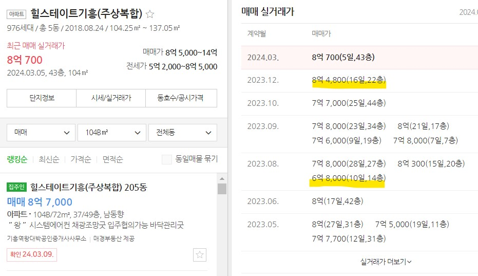 - 실거래 내역을 분석해 보면 2023년 8월에 6억 8천만 원에 거래 내역이 있고, 2023년 12월에 8억 4,800만 원에 거래된 내역이 있다. 이 내역만 보면 기사에서 언급한 내역이 맞다. 하지만 힐스테이트 기흥의 경우 무려 최대 49층짜리 주상복합 건물이라는 것을 봐야 한다.