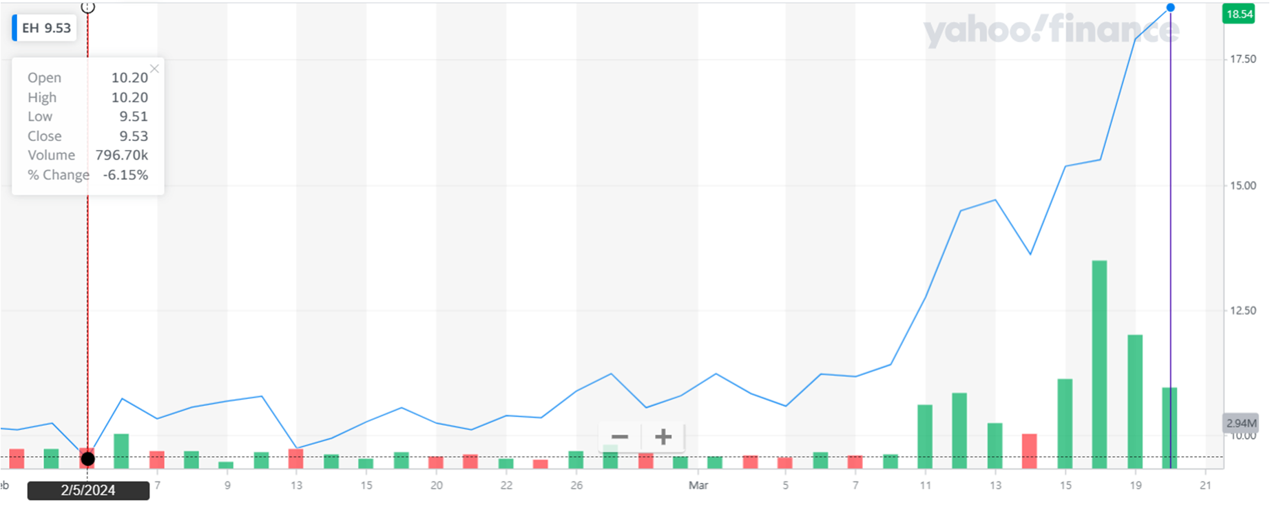 ehang은 지난해 4분기에 흑자 전환에 성공했다고 발표했습니다. 그리고 EH216-S의 온라인 판매에 대한 소식이 발표되면서 최근 주가가 급격하게 올랐습니다. 2월 초에 10.2달러였던 주가가 최근에는 18.54 달러까지 오르면서 거의 80%가 오르고 있습니다. 작년에 총 52대의 드론택시를 인도했던 ehang이, 올해는 온라인 판매를 시작으로 과연 몇 대의 드론택시를 인도할 수 있을까요?