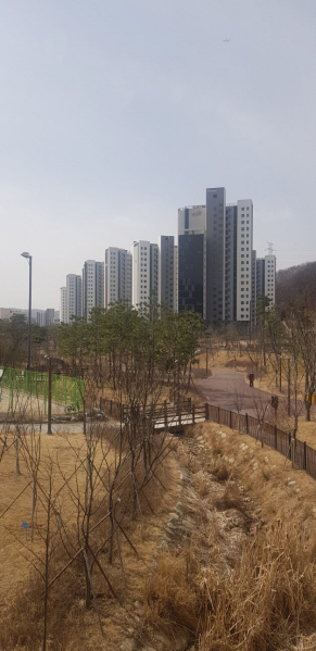 1번에서 바라보면 공원이 한눈에 보이고, 바로 앞에 농구장이 있습니다. 옆으로 산책로가 잘 되어 있고, 실개울이 흐르고 있습니다. 실개울에는 겨울이라서 그런지 물이 거의 없어서 아쉽네요. 여름이 되고 물이 많아져서 실개울이 흐르면 정말 멋진 산책로가 될 것 같습니다.