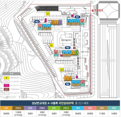 9단지, 판교 포레나인 ᐅ 9단지 판교 포레나인은 LH 국민임대 아파트로 2023년 7월 입주를 시작했고, 221세대 4개동으로 구성되어 있습니다. LH(한국토지주택공사)가 주관하는 무주택 서민의 주거복지를 위한 국민임대주택으로 29형, 38형, 46형 3가지 형태로 분양했습니다. 대장지구 단지 중에서는 입구에 위치해 있어, 용인 서울 고속도로와 가장 가까운 장점이 있습니다.