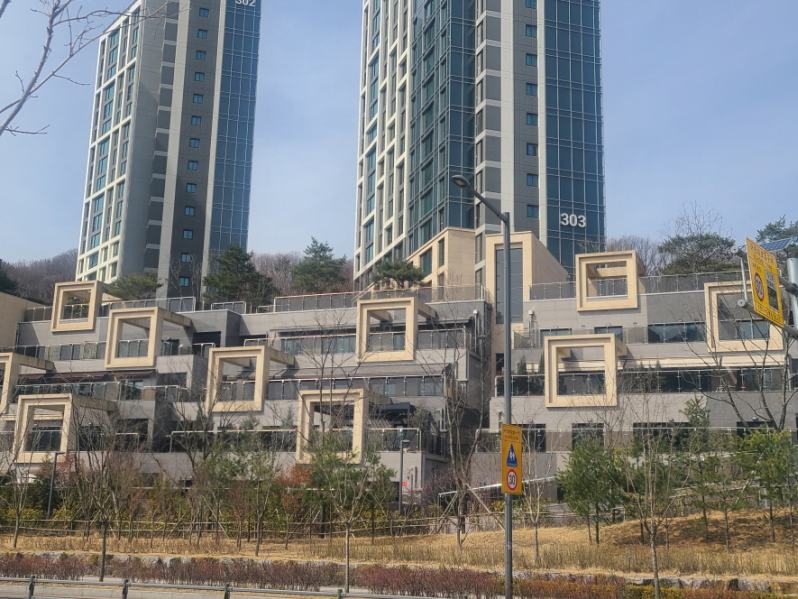 맞은편에는 근린주택 단지가 있습니다. 판교 대장지구에는 상업 시설이 상대적으로 많지 않아서, 근린주택의 1층에 있는 근린시설이 중요한 역할을 하고 있습니다. 바로 맞은편 근린주택 1층에 투썸플레이스가 크게 입점해 있습니다. 대장지구에는 스타벅스가 없는데, 이런 카페들이 그 자리를 대신하고 있습니다.
