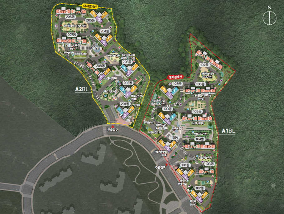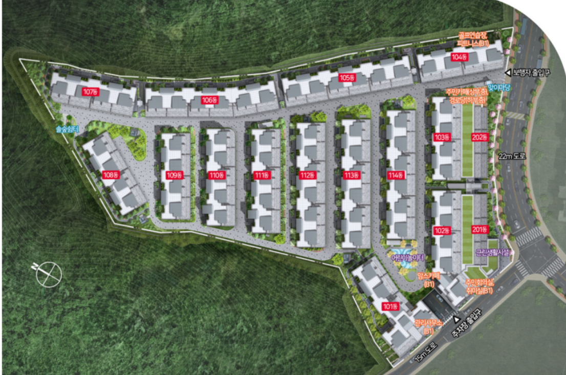 단지배치도에서 보듯이 전체 단지가 숲 속에 둘러 쌓여 있는 형태입니다. 따라서 4계절 변화에 따른 숲을 전망하는 모습이 정말 멋진 것 같습니다. 또한 판교터널과 제일 가까운 위치에 있어 상대적으로 자차 이용이 편리한 장점이 있습니다.