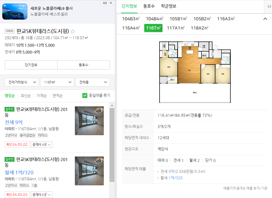 테라스 형은 12세대가 분양을 했고, 현재 월세 2건 전세 1건이 올라와 있습니다. 월세가 1억에 320만 원으로 올라와 있네요. 한번쯤 살아보고 싶기는 하지만, 월세가 웬만한 월급을 맞먹는 금액이라서 다음 기회를 기약해야겠네요. (참고로 B1, B2, B3 단지는 연립주택 부지입니다)