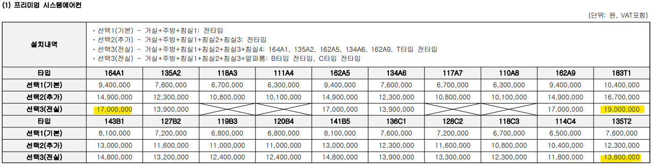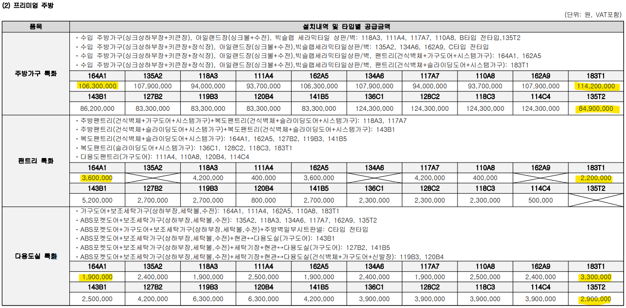 분양가는 전용 110~119㎡ 14억1900만~14억8300만원, 120~136㎡ 15억 800만~16억 3200만 원, 141~183㎡ 17억 3000만~22억 1600만 원으로 3.3㎡당 분양가가 3400만~3500만 원 수준입니다. 분양가상한제가 적용되었지만 전반적으로 비싼 분양가입니다. 또한 발코니 확장, 시스템에어컨, 주방가구, 팬트리, 다용도실, 주방가전 등의 옵션을 선택하면 전체적인 분양가는 더 올라갑니다.