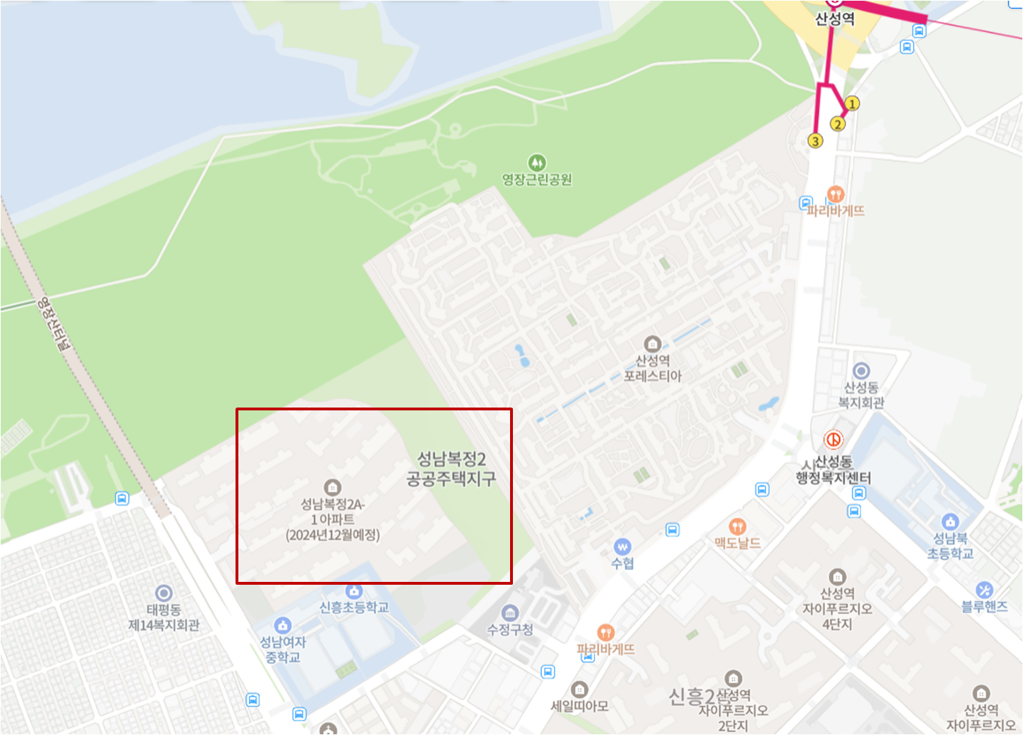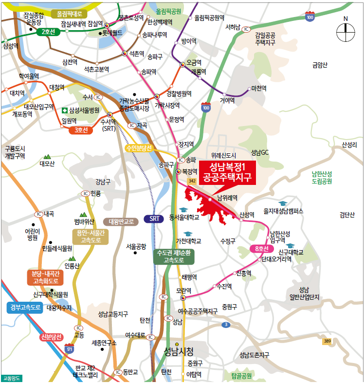 ▷복정1지구(64만6천㎡)는 성남시 수정구 복정동과 신흥동, 창곡동 일원으로 위례신도시 남서쪽에 지방도 342호선을 따라 조성되고 있습니다. 서울 지하철 8호선 복정역, 산성역도 가깝고 인근 영장산 자락에 걸쳐 있습니다.