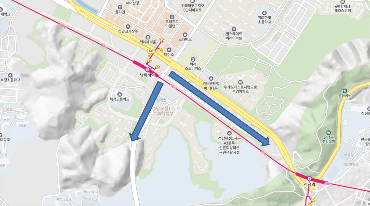헌릉로를 따라서 남위례역에서 산성역으로 이어지는 지역도 전반적으로 높아지는 지형입니다. 이쪽 방향은 산성역 근처 부근에서 급격히 경사가 심해져 복정1지구에는 크게 영향은 없을 것 같습니다.