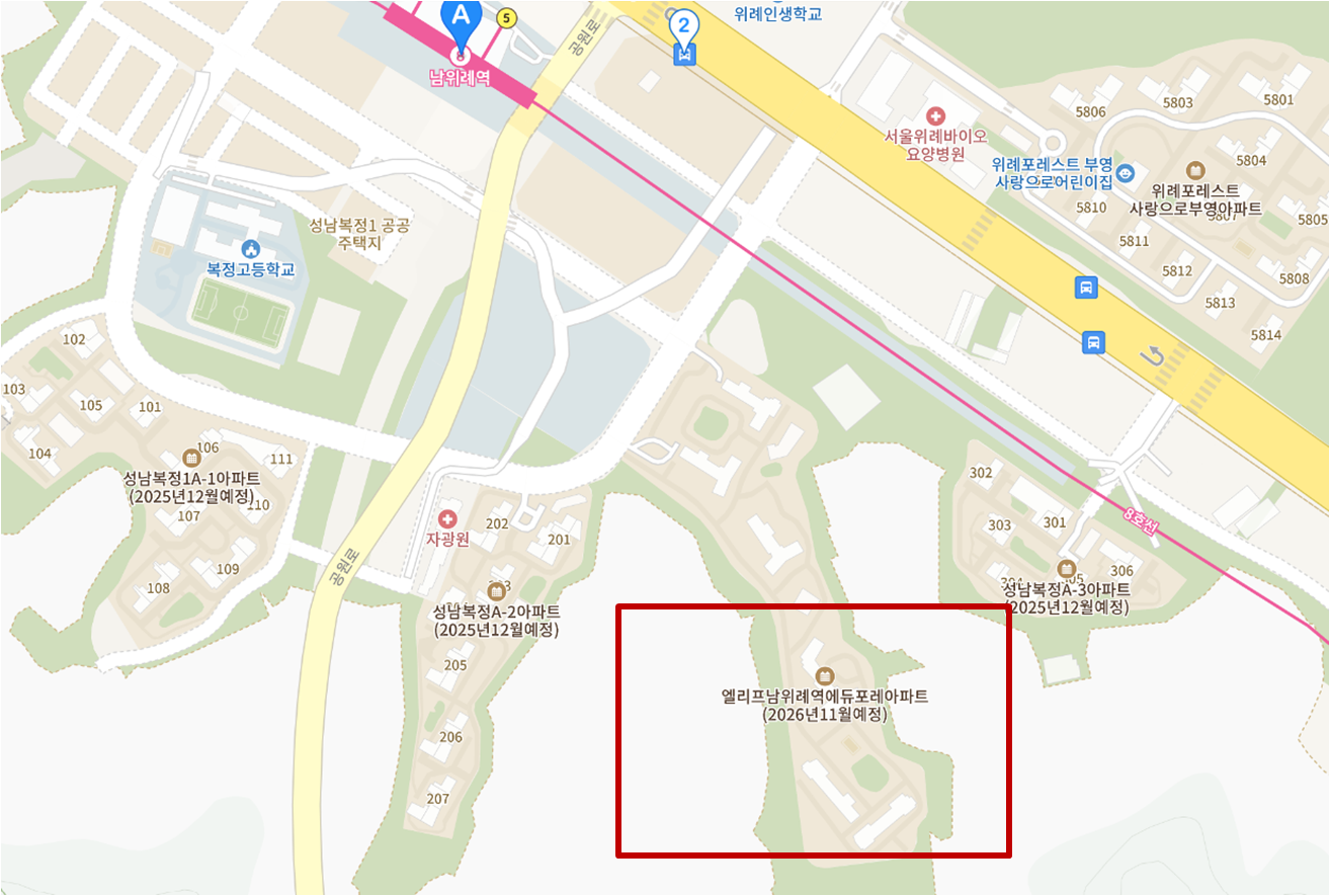 엘리프 남위례역 에듀포레는 2027년 6월 입주 예정으로 주변의 다른 단지에 비해 입주가 늦은 편 입니다. 입주일은 사전청약 시에는 2026년 11월로 공고되었으나, 본 청약 공고에서는 7개월 가량 늦어졌습니다. 그래서인지 현재 아직 건물이 올라간 것은 보이지 않고, 기반 다지기 공사 중으로 보입니다. 멀리 산성역 포레스티아아파트가 보이는데, 조만간 엘리프 남위례역 에듀포레가 더 멋있게 공사가 되겠죠?
