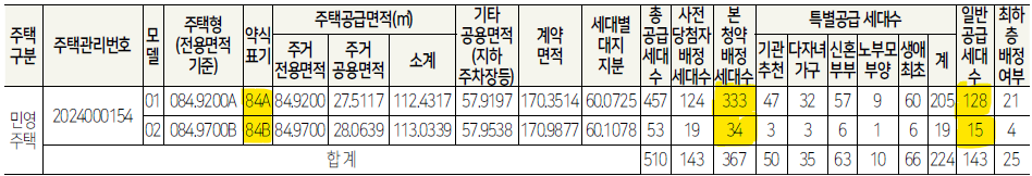 - 전용면적 60㎡ 초과 85㎡이하에 해당하므로 가점제 70%, 추첨제 30%의 적용을 받습니다.