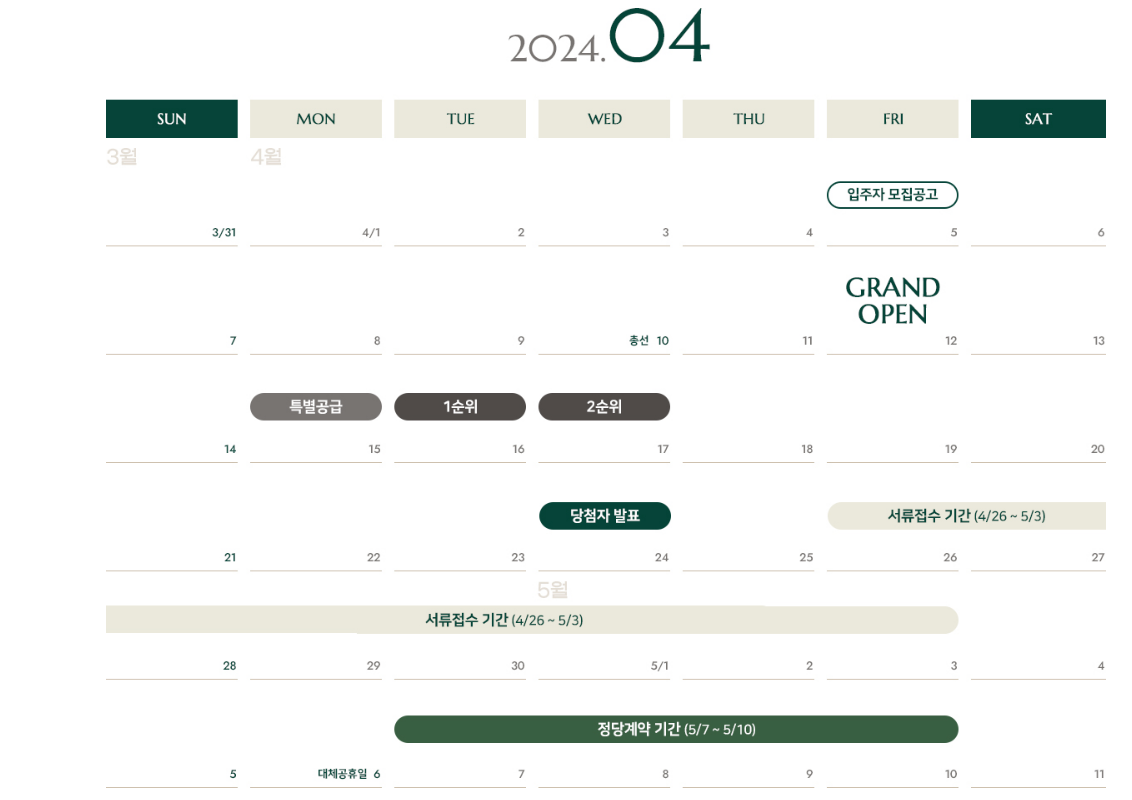 - 특별 공급 4/8일, 1순위 4/9일, 2순위 4/10일 순으로 진행됩니다.