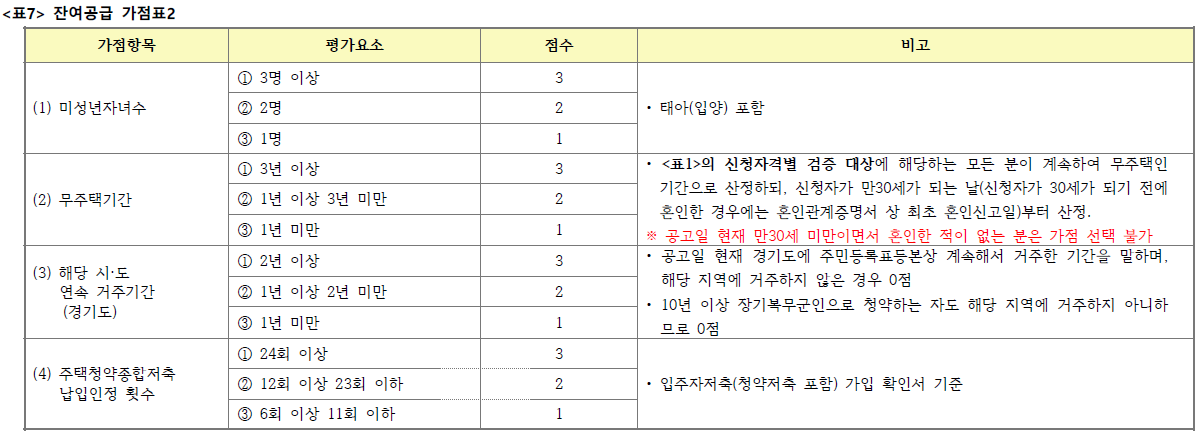 - 경쟁이 있을 경우에는 아래 “<표7> 잔여공급 가점표2”의 가점항목 다득점순으로 선정하되, 가점이 동일한 경우 추첨으로 당첨자를 선정합니다.