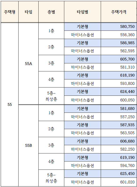 ▷55㎡는 55A, 55B 2가지 타입으로 분양가는 처저가는 1층 580750,000원에서 최고가는 5층 이상으로 625,450,000원입니다. 이 타입의 경우 마이너스 옵션을 선택할 경우 약 24,000,000원이 빠지는 가격입니다.