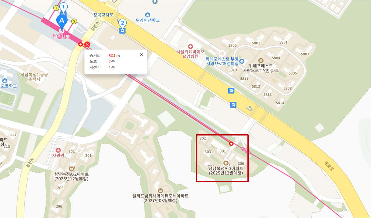 A3 블록의 경우 경사가 없는 평지에 아파트가 들어선다는 장점이 있습니다. 하지만 제일 큰 단점으로 8호선 전철이 지상으로 지나는 전철 노선과 붙어있다는 점입니다. 8호선의 경우 배차 간격도 비교적 짧고 왕복으로 오가는 전철이 수시로 지나다니는데, 이때 발생하는 소음으로 인해 입주민들은 피해를 받을 것 같습니다. 입주 시점에 소음을 저감 시킬수 있는 방음벽등이 고려되어야할 것 같은데, 아직 계획도 상에는 반영되어 있지는 않습니다.
