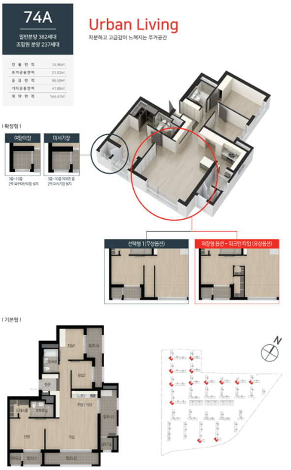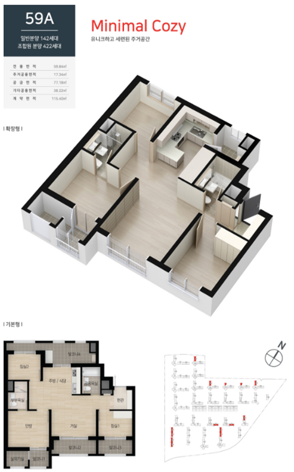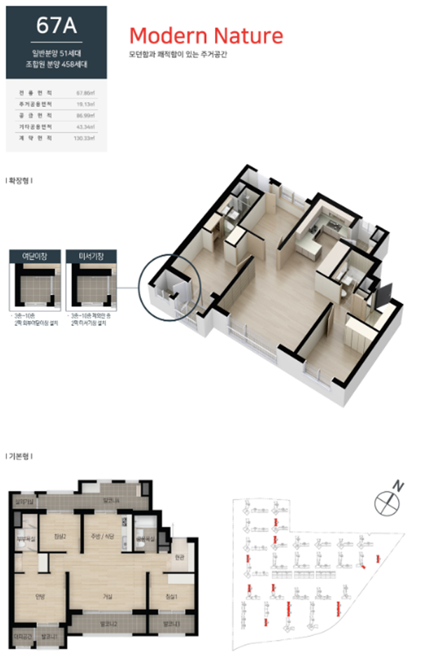 ▷산성역 포레스티아는 분양 당시 총 4,089세대 중 1,705세대를 일반분양했습니다. 전용 면적 59, 67, 84, 98㎡ 평면도는 7가지 형태입니다. 평면도를 보면 전체적으로 맞통풍 구조로 설계되어 환기 및 통풍에 유리하게 되어 있습니다.