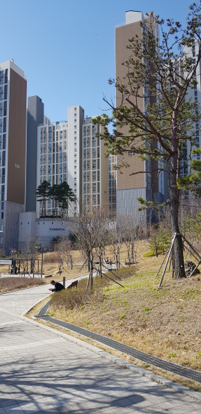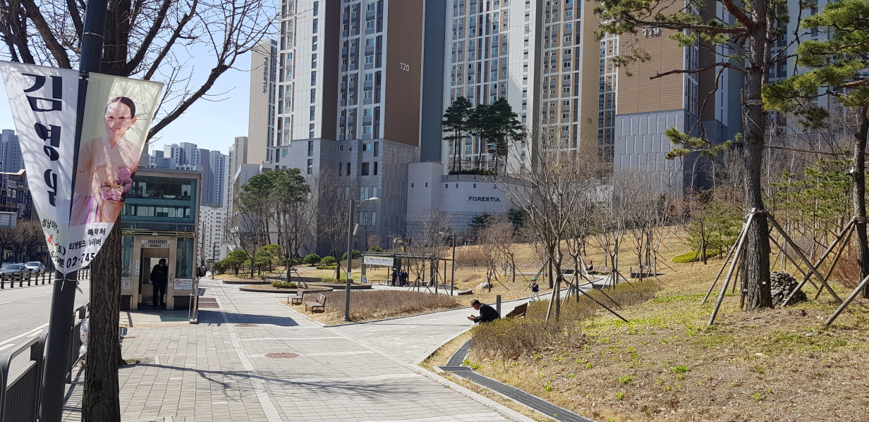 복정1지구 A3블록에서 남한산성역으로 걸어가면 경사가 급격히 높아지면서 꼭대기에 새 아파트가 보입니다. 바로 산성역 포레스티아 아파트로 신흥주공아파트와 통보8차공원아파트를 통합 재건축한 아파트입니다. 지하 3층 ~ 지상 28층 39개 동으로 총 4089세대로 엄청난 규모의 단지입니다. HDC현대산업개발, 포스코건설, 롯데건설 3사가 공동 시공한 아파트 단지로 2017년에 조합원분을 제외한 1705세대를 일반분양했습니다.