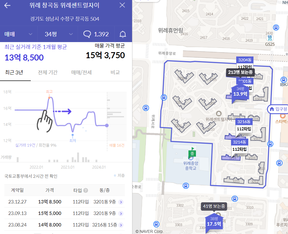 최근 위례센트럴자이를 살펴보면 34평형이 13억 8,500만원에 거래된 이후에 호가가 상승하여 현재는 15억 3,750만원에 형성되어 있습니다. 이러한 흐름은 산성역 포레스티아에도 동일하게 적용될 것이고 앞으로 조금씩 호가가 상승할 것으로 예상됩니다. 다만, 이미 12억원의 매물은 위례와 갭(가격 차이)이 크지 않아 추가적인 상승하기 위해서는 시간이 더 필요해 보입니다.