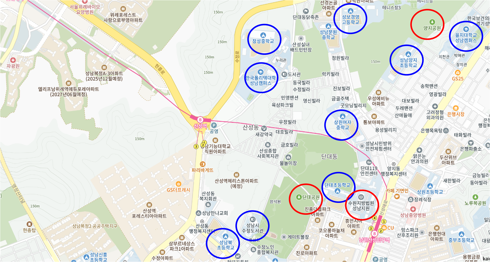 - 산성구역 (산성역헤리스톤) 주위에는 많은 교육시설이 있습니다. 우선 성남북초등학교, 단대초등학교, 성남양지초등학교가 인접해 있고, 창성중학교, 상원여자중학교, 성보경영고등학교가 있습니다. 한국폴리텍대학성남캠퍼스, 을지대학교성남캠퍼스도 근거리에 위치해 있습니다.