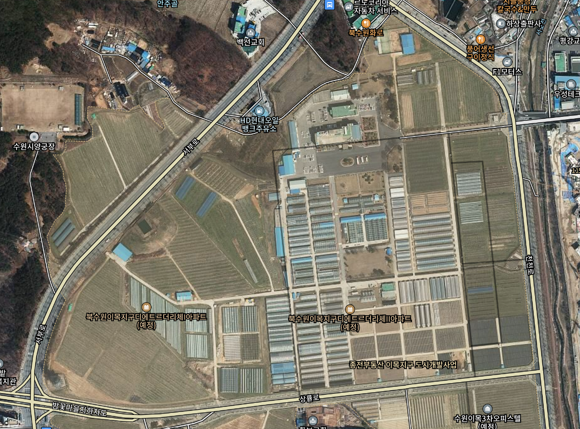 이목지구는 수원에서도 북쪽에 위치한 북수원, 북수원 중에서도 거의 의왕과 붙어 있는 끝에 위치하고 있습니다. 그래서 종전부동산 개발이 되기전에는 논/밭의 형태로 시골 같은 분위기였습니다.