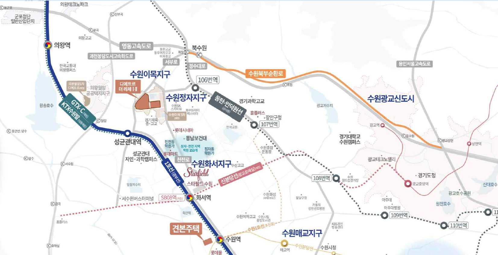 앞으로 수원역에 GTX-C가 개통되고, 인접한 수원정자지구에 동탄-인덕원선이 개설되면 북수원은 더 빠르게 발전하리라 봅니다.