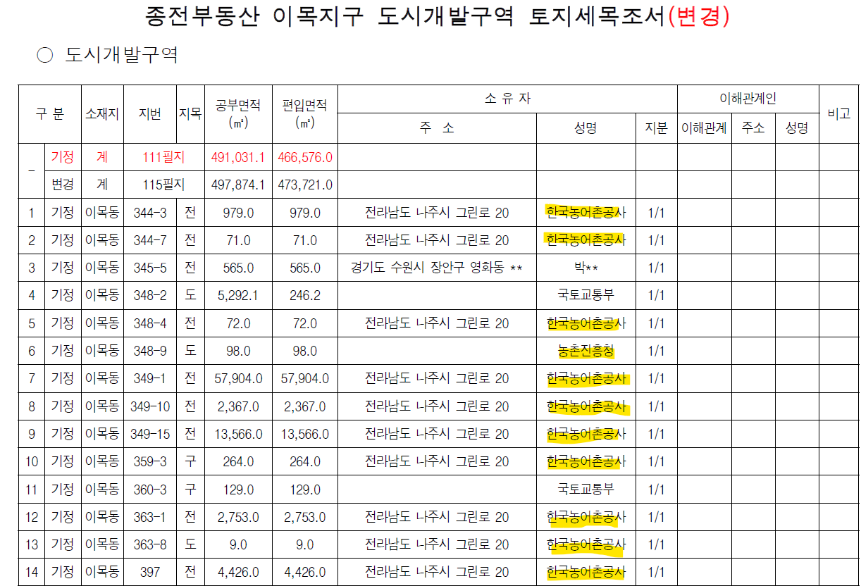 위성사진으로 이전의 상태를 확인해 보면 전부 논/밭 그리고 비닐하우스로 이루어진 지역이었습니다. 토지세목조서를 보면 대부분 토지가 지목이 전이고 소유주가 한국농어촌공사인 것을 알수 있습니다.