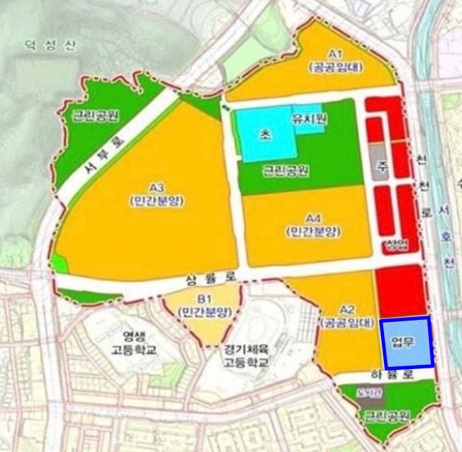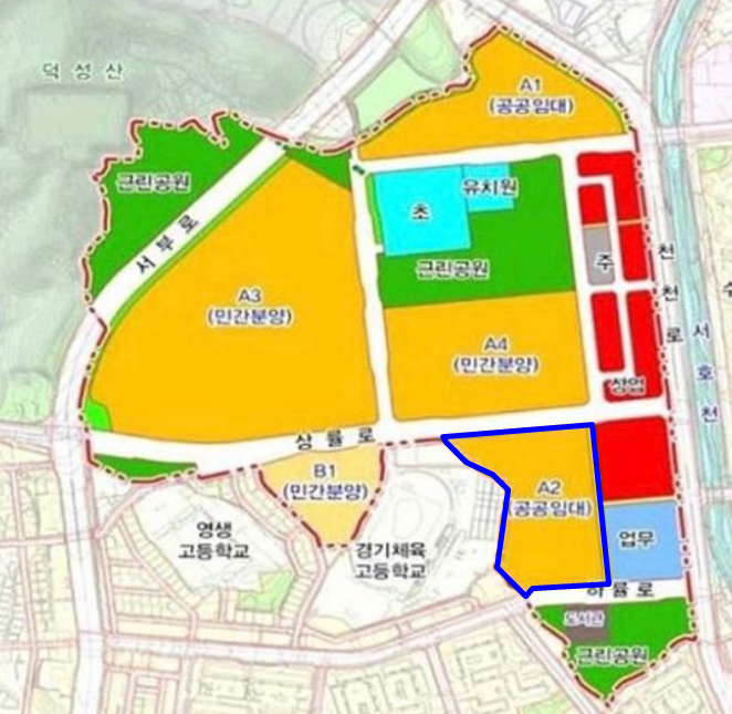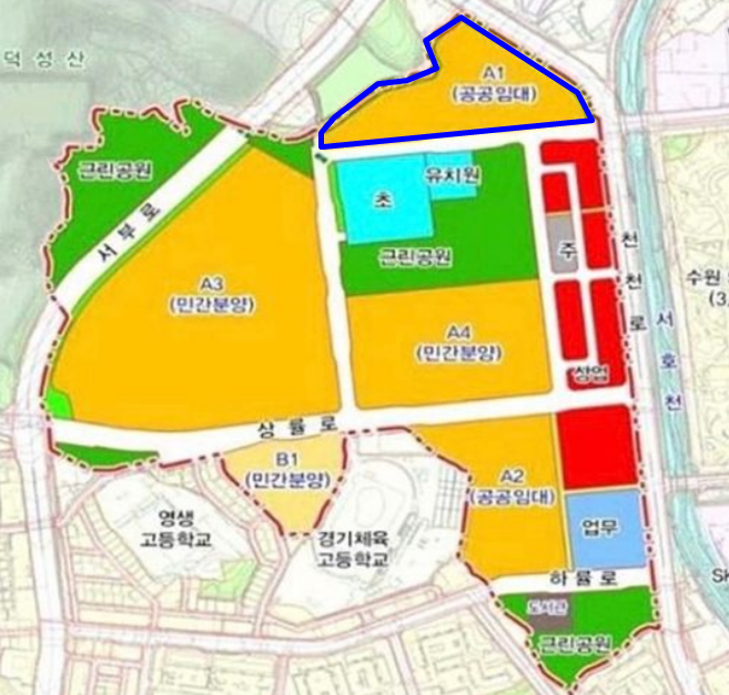 ▷수원 이목지구 A2블록은 공공임대로 예정되어 있습니다. 전용면적 60㎡ 이하, 775세대로 분양 예정이며 전체 블록면적은 31,786㎡ 입니다. A2블록의 경우 경기체육중/고등학교와 인접하고 있어 경기체육중/고등학교의 큰 트랙을 이용할 수 있습니다. 운동하기에는 참 좋은 환경입니다.