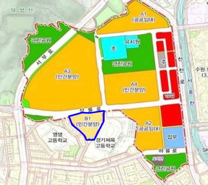▷수원 이목지구 B1블록은 연립주택(민간분양)으로 예정되어 있습니다. 전용면적 60㎡ 이하, 194세대로 분양 예정이며 전체 블록면적은 15,545㎡입니다. 요즘 연립주택용지에는 판교 대장지구 금강 TH212와 같이 테라스하우스를 짓는 분위기인데, 이곳에는 어떤 주택이 들어올지 지켜봐야 겠습니다.