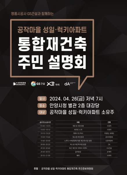 ▷공작마을 성일 럭키아파트 통합 재건축 주민 설명회는 2024년 4월 26일 저녁 7시 안양시청 별관 2층 대강당에서 진행되었습니다. 공작마을 성일 럭키아파트 소유주를 대상으로 진행되었으며, 민병덕 의원(더불어민주당, 동안구 갑)과 유영일 도의회 도시환경위원장, 윤해동 안양시의회 의원, 평촌재건축연합회 임원진 및 주민 760여명 이상이 참석했습니다. 처음에는 700석을 채우기도 힘들 것 같다는 주최측 의견이었는데, 생각보다 많은 인원이 참석해서 관계자들이 놀랐다고 합니다.