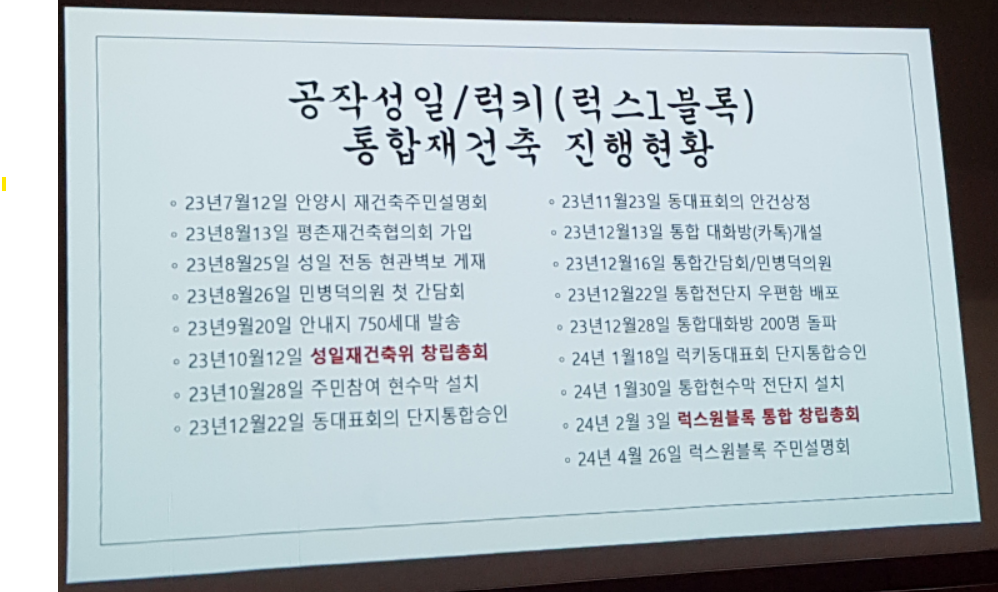 럭스원 블럭의 시작은 2023년 10월 12일 성일재건축위 창립총회로 시작되었습니다. 주로 성일아파트 내에서 재건축 논의가 시작되다가 럭키 아파트와의 꾸준한 물밑 접촉을 통해서 통합 재건축을 추진했다고 합니다. 2024년 2월 3일 럭스원블록 통합 창립총회가 시작되면서 본격적으로 통합 재건축을 진행하게 됩니다.