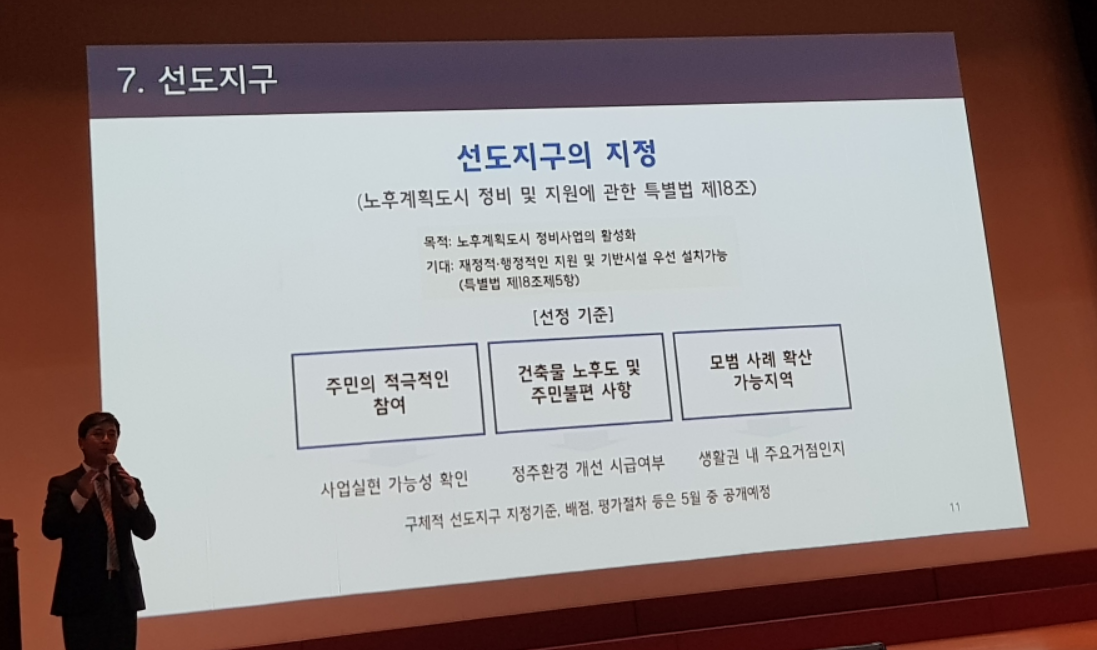 ▷선도지구의 지정은 노후계획도시 정비 및 지원에 관한 특별법 제18조에 따라 진행된다. 노후계획도시 정비사업의 활성화를 위해서 재정적, 행정적인 지원 및 기반시설을 우선 설치 가능하게 된다. 구체적인 선도지구 지정기준, 배점, 평가절차 등은 5월 중에 공개예정이다.