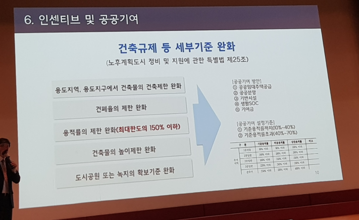 ▷노후계획도시 정비 및 지원에 관한 특별법 제25조에 따라 건축규제 등 세부기준이 완화된다. 이 중에 가장 중요한 사항은 인센티브 부분으로 용적률의 제한을 완화하여 최대한도의 150%까지 가능하게 된다. 보통 아파트의 경우 3종 일반으로 최대 용적률은 300%가 된다. 여기서 최대한도를 150%까지 상향 즉 450%까지 가능하게 된다.