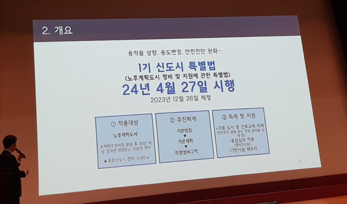 ▷1기 신도시 특별법(노후계획도시 정비 및 지원에 관한 특별법)은 2023년 12월 26일에 제정되었다. 이후 2024년 4월 27일부터 시행에 들어간다. 이 법을 통해 각종 특례 및 지원이 되는데 안전진단 완화 또는 면제, 용적률 상향, 통합심의 적용(절차간소화) 등이다.