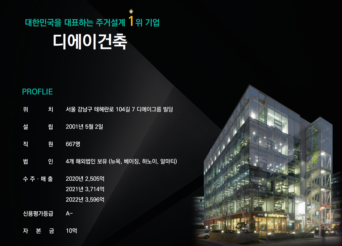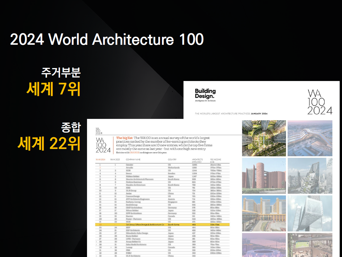 ▷럭스원 블록(공작 성일 럭키) 재건축 사업방향에 대해서 디에이그룹엔지니어링종합건축사무소에서 발표를 진행했습니다. 디에이건축은 2001년에 설립되었으며, 2022년 3,596억 원의 매출을 기록했습니다. 관련 업계에서 1위를 하고 있으며 거의 유일하게 신용평가등급 A-를 기록하고 있다고 합니다. 2024년 World Architecture 100 발표에서 주거 부분 세계 7위, 종합 세계 22위를 기록했습니다.