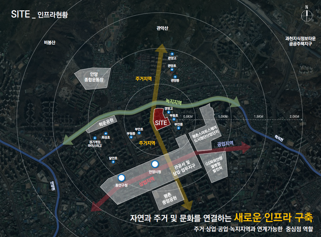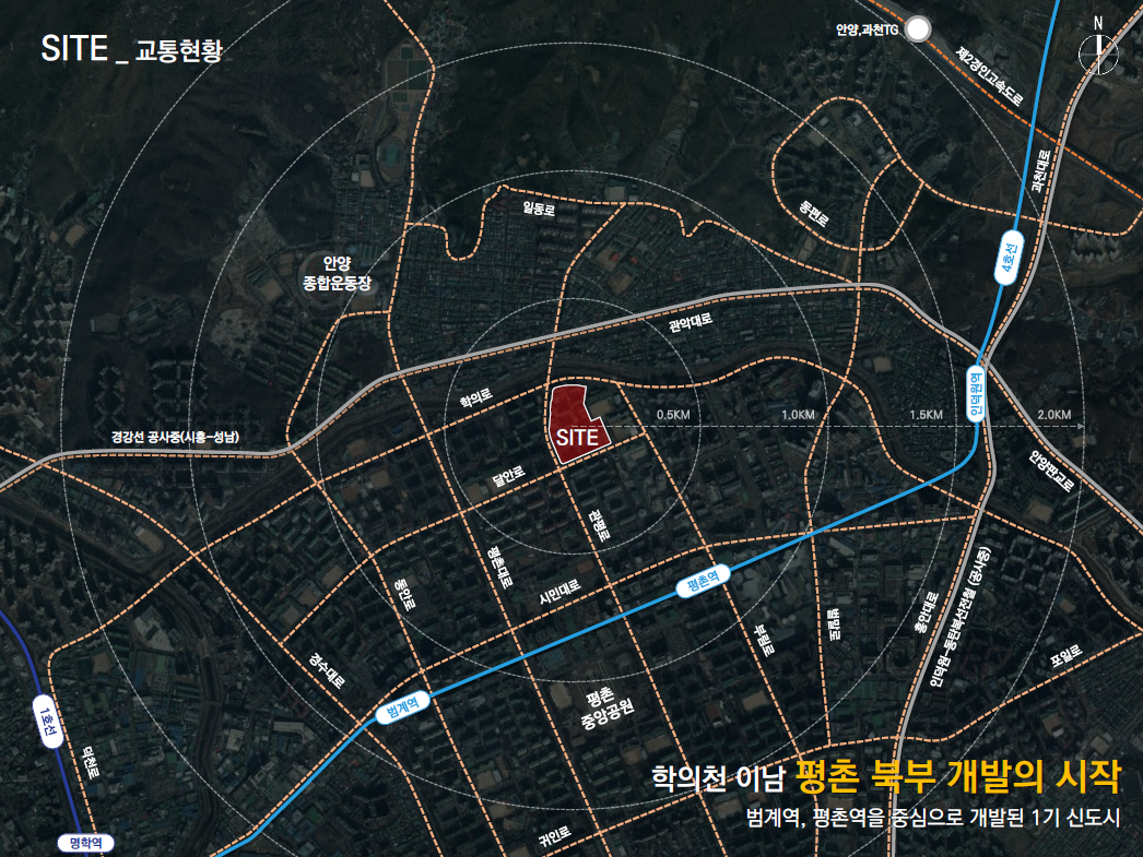 - 해당 Site에서 500m 이내에는 현재 공사 중인 경강선(시흥~성남)이 있습니다. 1km 이내에는 4호선 평촌역이 있으며 2km 이내에는 GTX-C 인덕원역이 예정되어 있습니다.