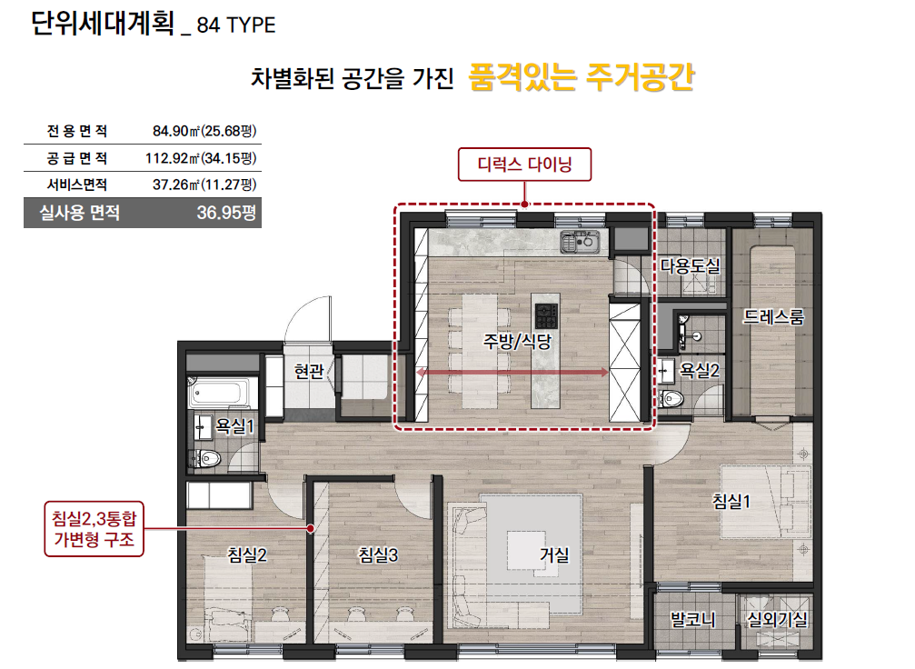 - 국민 평형 84 type은 4베이 구조로 서비스 면적을 확보하고, 침실 2/3에 가벽을 적용하여 통합하여 사용할 수도 있고 각각 분리하여 사용할 수 있습니다.