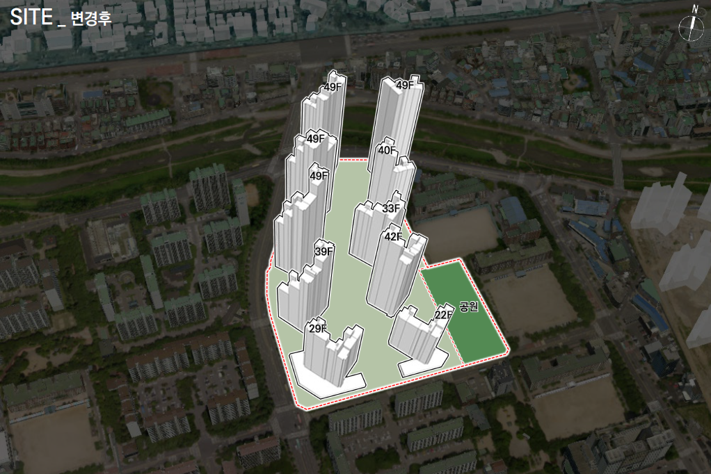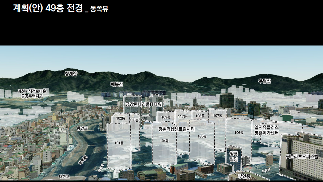 - 현재 럭키 공작 단지에 위치해 있는 공원은 부림초등학교 방면으로 이동하게 됩니다. 공동 이용시설이 도로와 접해야 하는 문제를 해결하고 평촌경영고등학교, 부림초등학교의 일조사선제한으로 인해 위치를 변경하게 되었습니다. 이러한 제한을 적용하여 설계하다 보니, 앞에 동에서 뒷동으로 갈수록 층고가 높아지는 배치를 구성하였습니다.