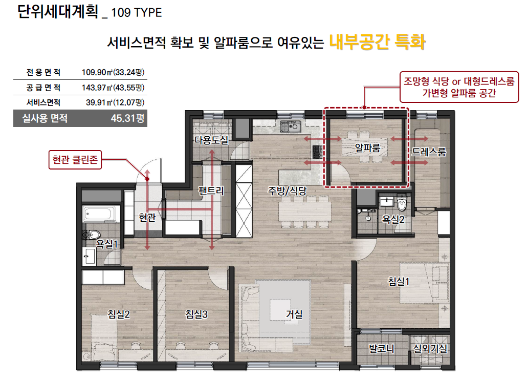 - 4 베이 구조를 채택하여 최대로 서비스면적을 확보하였으며 알파룸으로 여유있는 내부공간을 특화하였습니다. 현관에서 바로 들어 오면서 팬트리와 연결되어 있어 바로 주방으로도 진입할 수 있도록 설계하였습니다. 알파룸은 가벽을 적용하여 사용자의 취향에 따라 조망형 식당, 대형드레스룸, 알파룸 등의 공간으로 활용할 수 있습니다.