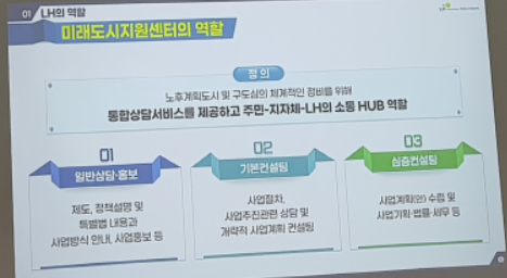 미래도시지원센터의 역할에 대한 정의는 '노후계획도시 및 구도심의 체계적인 정비를 위해 통합상담서비스를 제공하고 주민-지자체-LH의 소통 HUB 역할' 입니다.