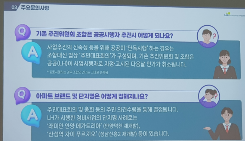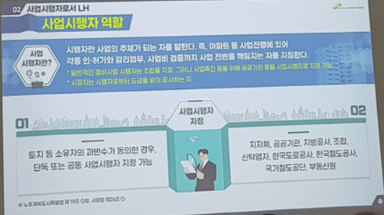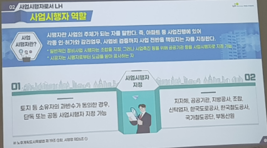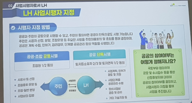 나중에 발표를 다 듣고 나서 생각해 보니 풍선효 통합재건축 추진준비위원회에서 LH를 시행자로 선정을 검토하고 있는 게 아닌가 싶습니다.