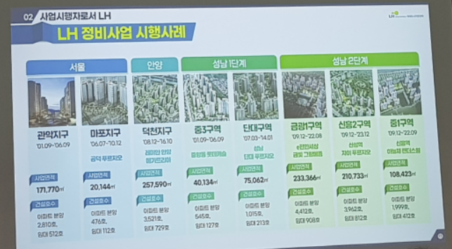 ▷서울, 안양, 성남 1단계, 성남 2단계 정비사업을 통해 사업시행자로서 LH의 경험이 많다는 것을 설명했습니다. LH 공공재건축 추진지역 신반포7차 공공재건축사업, 망우1구역 공공재건축사업, 중곡아파트 공공재건축사업을 추가로 설명했습니다.