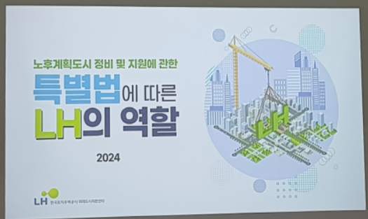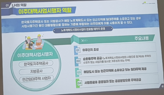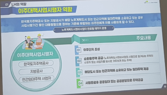 ▷이번에는 '노후계획소디특별법에 따른 LH의 역할'이라는 주제로 LH미래도시지원센터 센터장님의 발표가 있었습니다. 이 주제는 다른 곳에서는 들을 수 없었던 주제로 생소한 내용이었습니다. 정확한 시간까지 측정하지는 않았으나 거의 1시간 정도 센터장님이 내용을 설명해 주셨습니다.