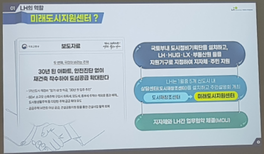 LH에서는 1월에 5개 신도시 내 상담센터(도시재창조센터)를 설치하고 주민설명회를 개최했다고 합니다. 이 도시재창조센터가 미래도시지원센터로 변경되었습니다.