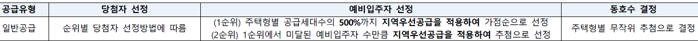 ▷당첨자 선정 방법 : (1순위) 주택형별 공급세대수의 500%까지 지역우선공급을 적용하여 가점순으로 선정