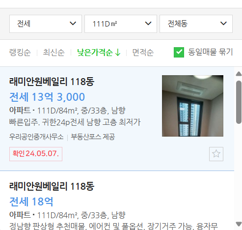 ▷래미안 원베일리 입주자모집공고와 동일한 84D 형의 전세 매물의 경우 네이버 부동산을 기준으로 18억 5,000만원에서 19억원입니다. 네이버 부동산에 나와 있는 실제 매물의 경우 13억 3,000만원이 최저가입니다만, 세부 내용에 24P로 되어 있는 것으로 보아 24평형을 잘못 올린 것으로 보입니다. 이 물건을 제외하면 최저가격은 18억원부터 시작하고 있습니다.