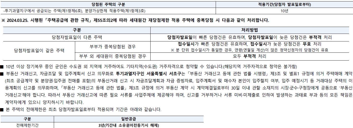 ▷본 주택은 수도권 투기과열지구 및 청약과열지역의 민간택지에서 공급하는 분양가상한제 적용 민영주택으로, 당첨자로 선정 시 「주택공급에 관한 규칙」 제54조에 따른 재당첨 제한을 적용받게 되며 기존 주택 당첨으로 인해 재당첨 제한 기간 내에 있는 분 및 그 세대에 속한 분은 본 아파트 청약이 불가합니다. 당첨자 발표일로부터 10년간 재당첨이 제한됩니다.