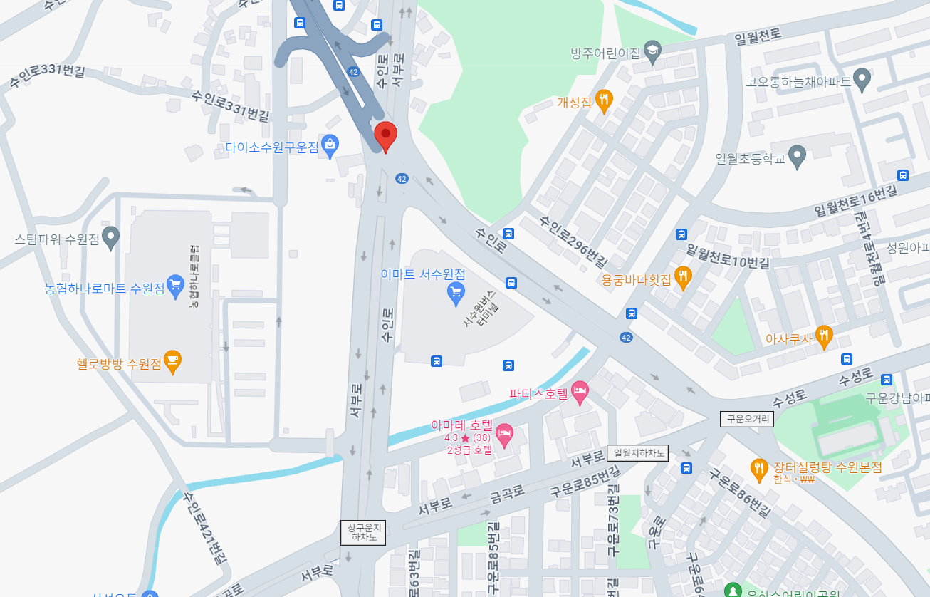 ▷현재 구운역의 위치를 나무 위키에서는 구운 사거리로 표시하고 있습니다. 구운 사거리 주변에는 농협하나로마트 수원점, 이마트 서수원점, 서수원버스터미널이 위치해 있어 구운역 설치시 바로 연계하여 이용할 수 있는 장점이 있습니다.