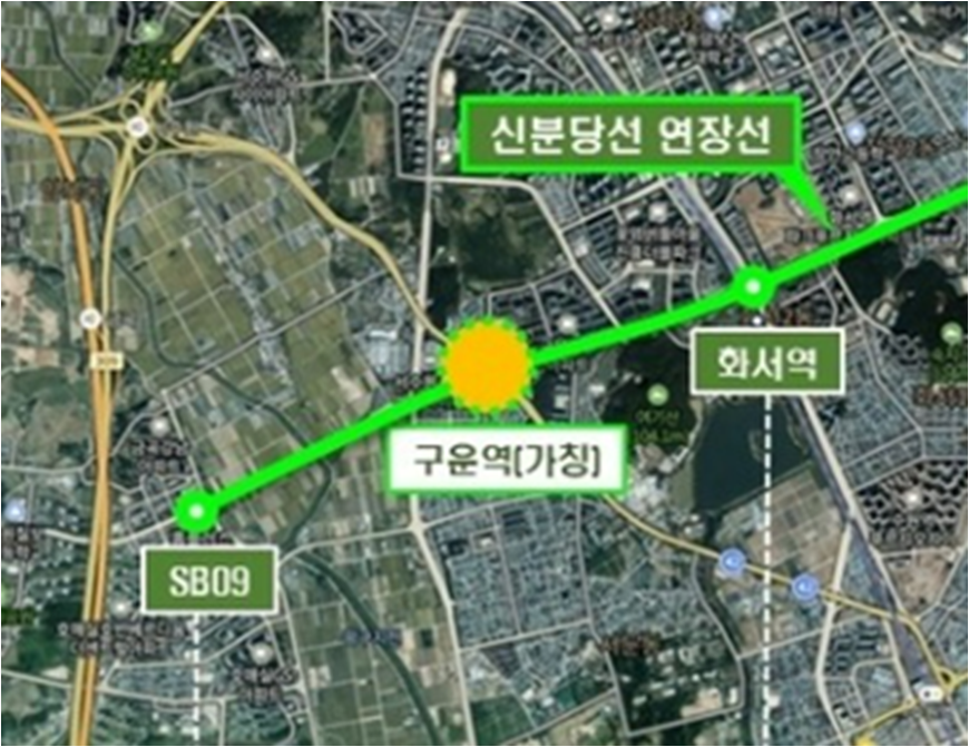 ▷지도에서 신분당선 호매실역 설치 예상지와 화서역 설치 예상역을 연결하여 그려보면 구운 사거리 부근이 아닌 구운 오거리를 지나는 것을 볼 수 있습니다. 또한 수원시에서 발표한 예상 노선도에서 구운역 부분을 확대해 보면 구운 사거리를 가기 전에 역이 설치되는 것을 볼 수 있습니다. 따라서 현재는 구운 사거리에 설치되는 것으로 보입니다.