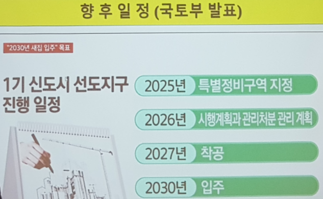이후 9월부터 선도지구 접수를 시작하고 10월에 평가를 거쳐 11월에 최종 선정하게 됩니다. 2025년에는 특별정비구역을 지정하고, 2026년에 시행계획과 관리처분 관리 계획을 거쳐 2027년에 착공하고 2030년에 입주한다는 계획입니다.